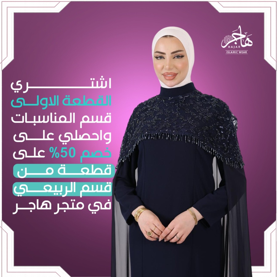 اشتري القطعة الاولى من قسم المناسبات لتحصلي على خصم ٥٠٪ على القطعة الثانية من قسم الربيعي في هاجر